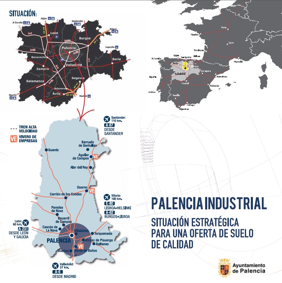 Palencia y su Alfoz presentan una generosa oferta de suelo industrial que se distribuye por toda la provincia aprovechando las potencialidades que generan las excelentes vías de comunicación que la surcan. Forma parte de la región de Castilla y León, limita al norte con la provincia de Santander, al oeste con León, con Valladolid al sur y con Burgos al este.