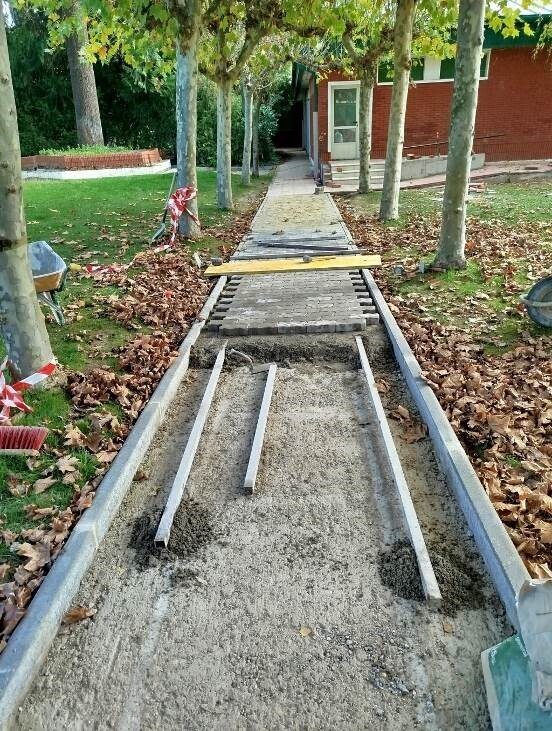 Otra consiste en la sustitución del pasillo adoquinado que se dirige desde los vestuarios hacia la zona de baño, el cual se encontraba totalmente deformado por hundimientos en el terreno convirtiéndolo en prácticamente impracticable. Se ha demolido y se ha ejecutado una solera que sirve de soporte a los nuevos adoquines, limitados lateralmente por nuevos bordillos, dotándoles de la linealidad y planeidad adecuadas.