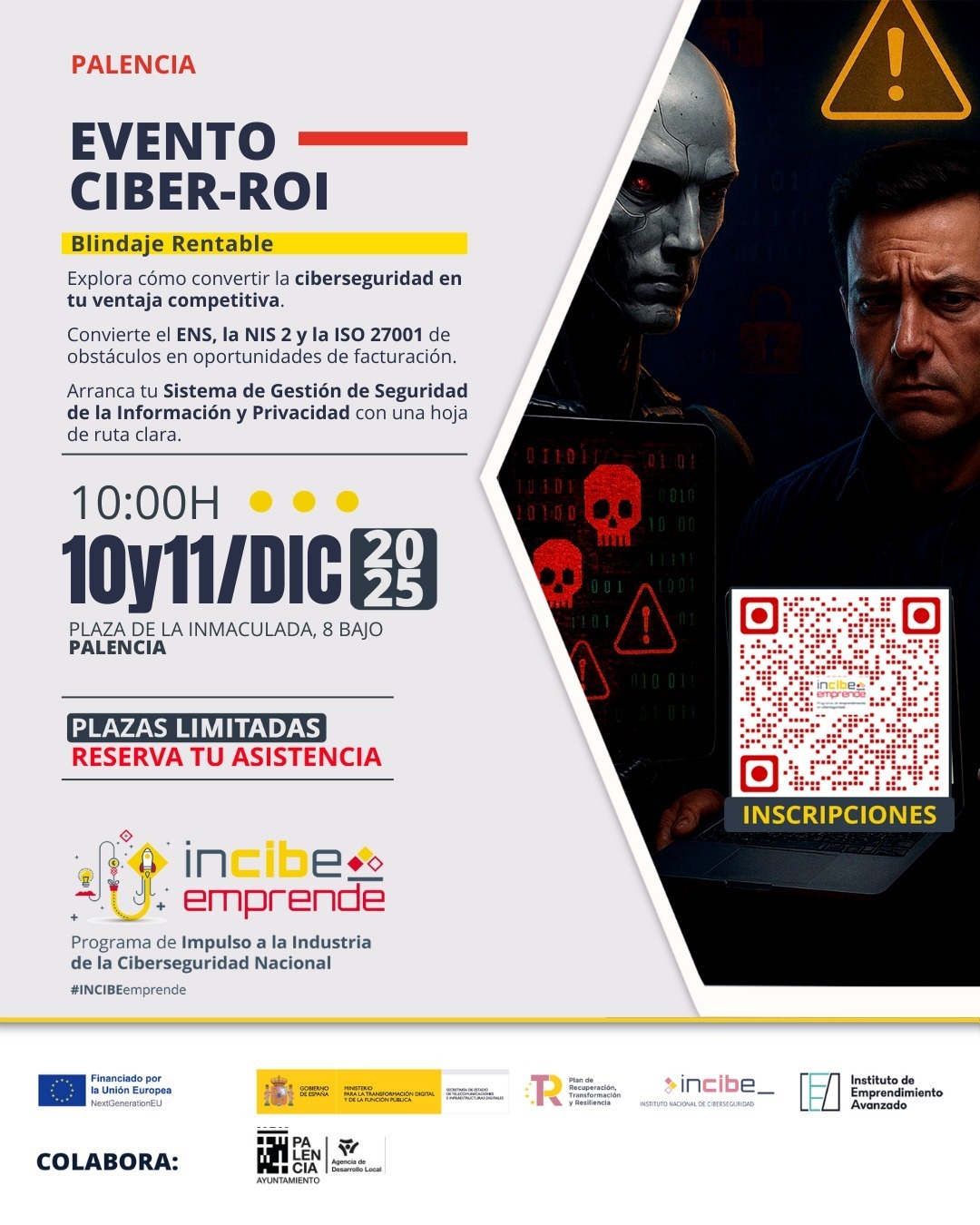Explora cómo convertir la ciberseguridad en tu ventaja competitiva.Los próximos 10 y 11 de diciembre de 2025, la Agencia de Desarrollo Local del Ayuntamiento de Palencia, en colaboración con INCIBE Emprende, te invita a participar en CIBER-ROI: Blindaje Rentable, un evento práctico y gratuito donde descubrirás cómo aplicar la ciberseguridad para fortalecer tu negocio y abrir nuevas oportunidades de facturación.