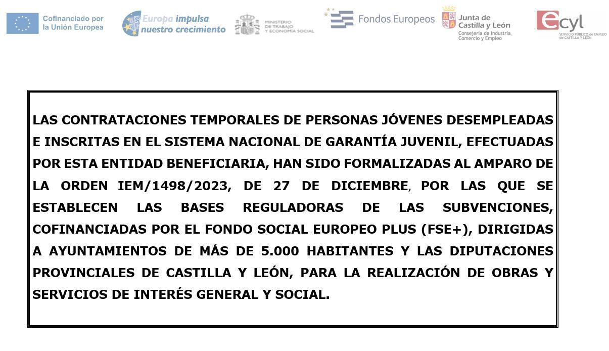 CONTRATACIONES DE PERSONAS JÓVENES DESEMPLEADAS E INSCRITAS EN EL SISTEMA NACIONAL DE GARANTÍA JUVENIL, EFECTUADAS POR ESTA ENTIDAD BENEFICIARIA, HAN SIDO FORMALIZADAS AL AMPARO DE LA ORDEN IEM/1113/2024, DE 24 DE OCTUBRE, POR LAS QUE SE ESTABLECEN LAS BASES REGULADORAS DE LAS SUBVENCIONES, COFINANCIADAS POR EL FONDO SOCIAL EUROPEO PLUS (FSE+), DIRIGIDAS A AYUNTAMIENTOS DE MÁS DE 5.000 HABITANTES Y LAS DIPUTACIONES PROVINCIALES DE CASTILLA Y LEÓN EN EL PROGRAMA DE PRIMERA EXPERIENCIA PROFESIONAL EN LAS ADMINISTRACIONES PÚBLICAS.
