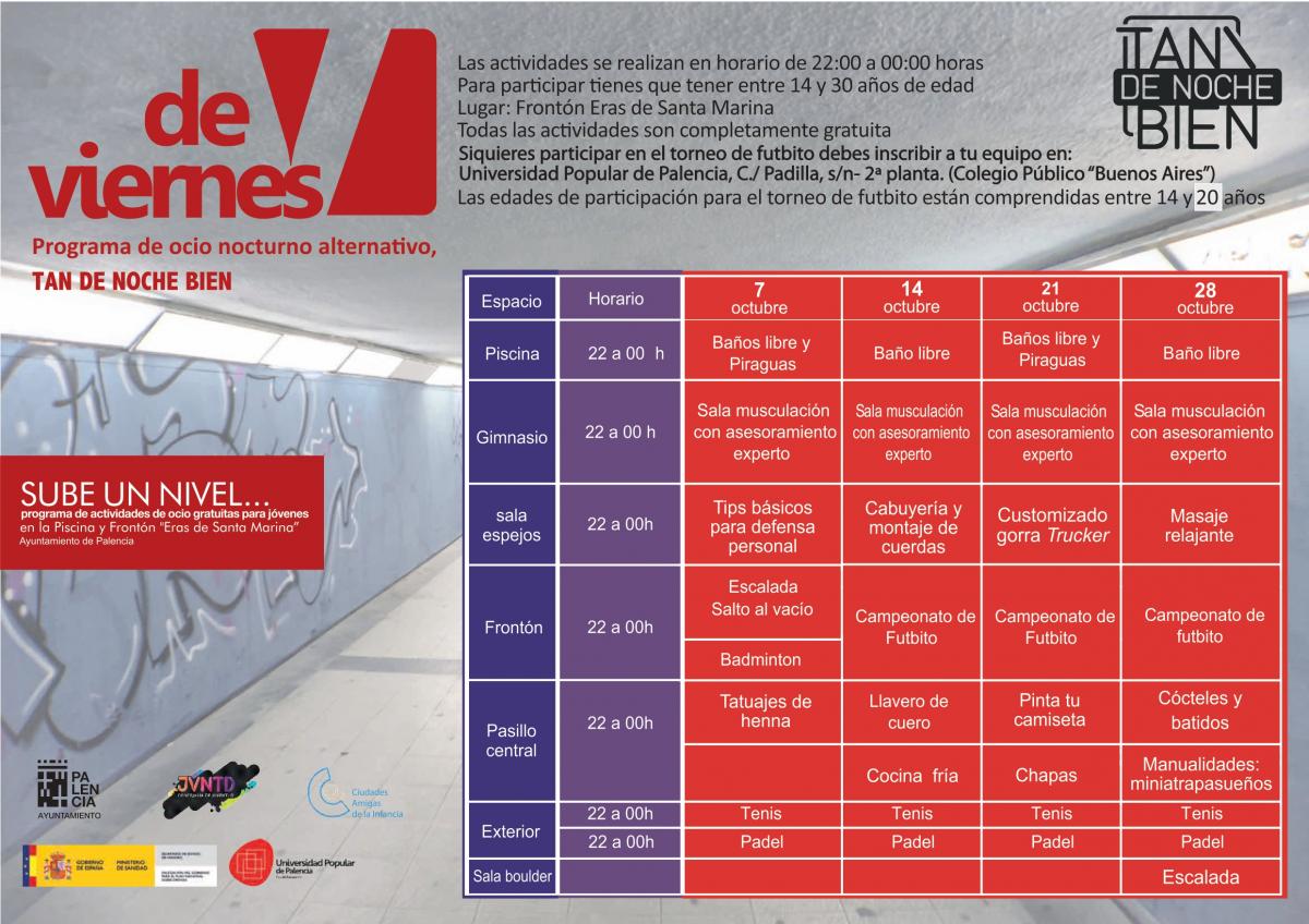 Las actividades se realizan en horario de 22:00 a 00:00 horas y tienes que tener entre 14 y 30 años. Se realizan en el Frontón Eras de Santa Marina y son totalmente gratuitas. Para el torneo de futbito (edades comprendidas entre 14 y 20 años), debes inscribir a tu equipo en la Universidad Popular de Palencia (Colegio Buenos Aires).