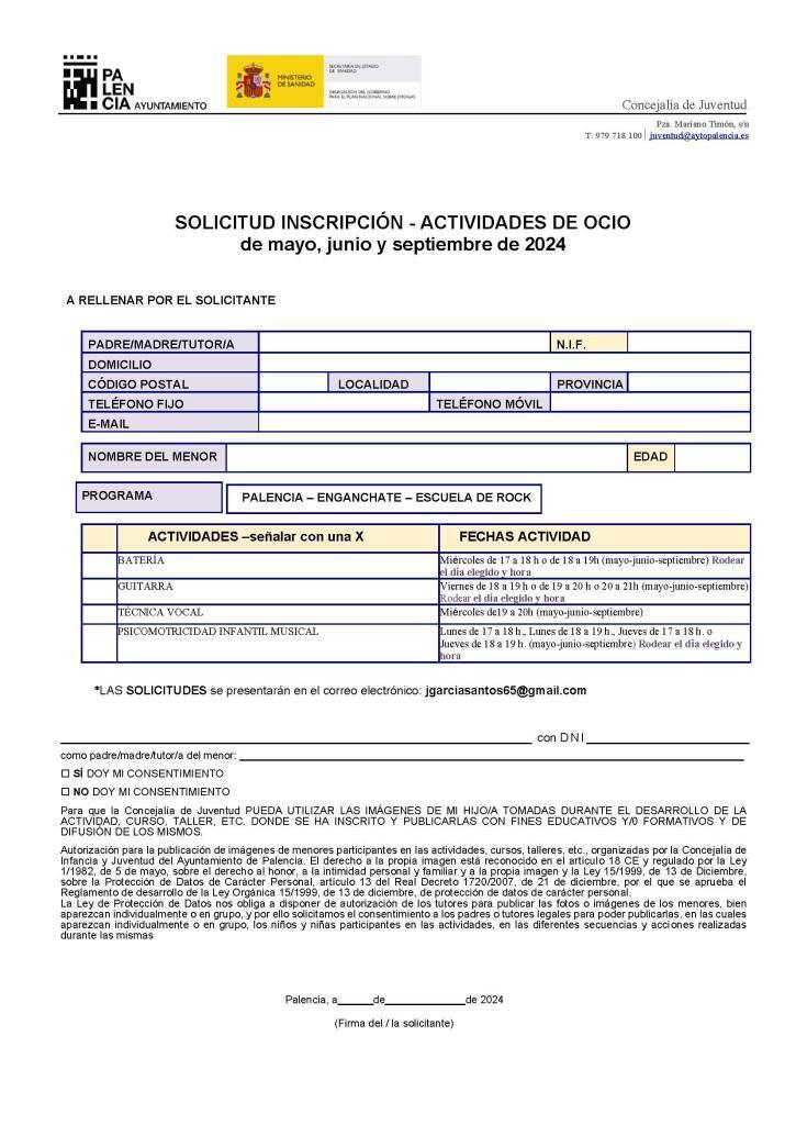 Las solicitudes se podrán recoger en la Concejalia de Juventud (Plaza Mariano Timón s/n 34005 Palencia) o descargar en el siguiente enlace: