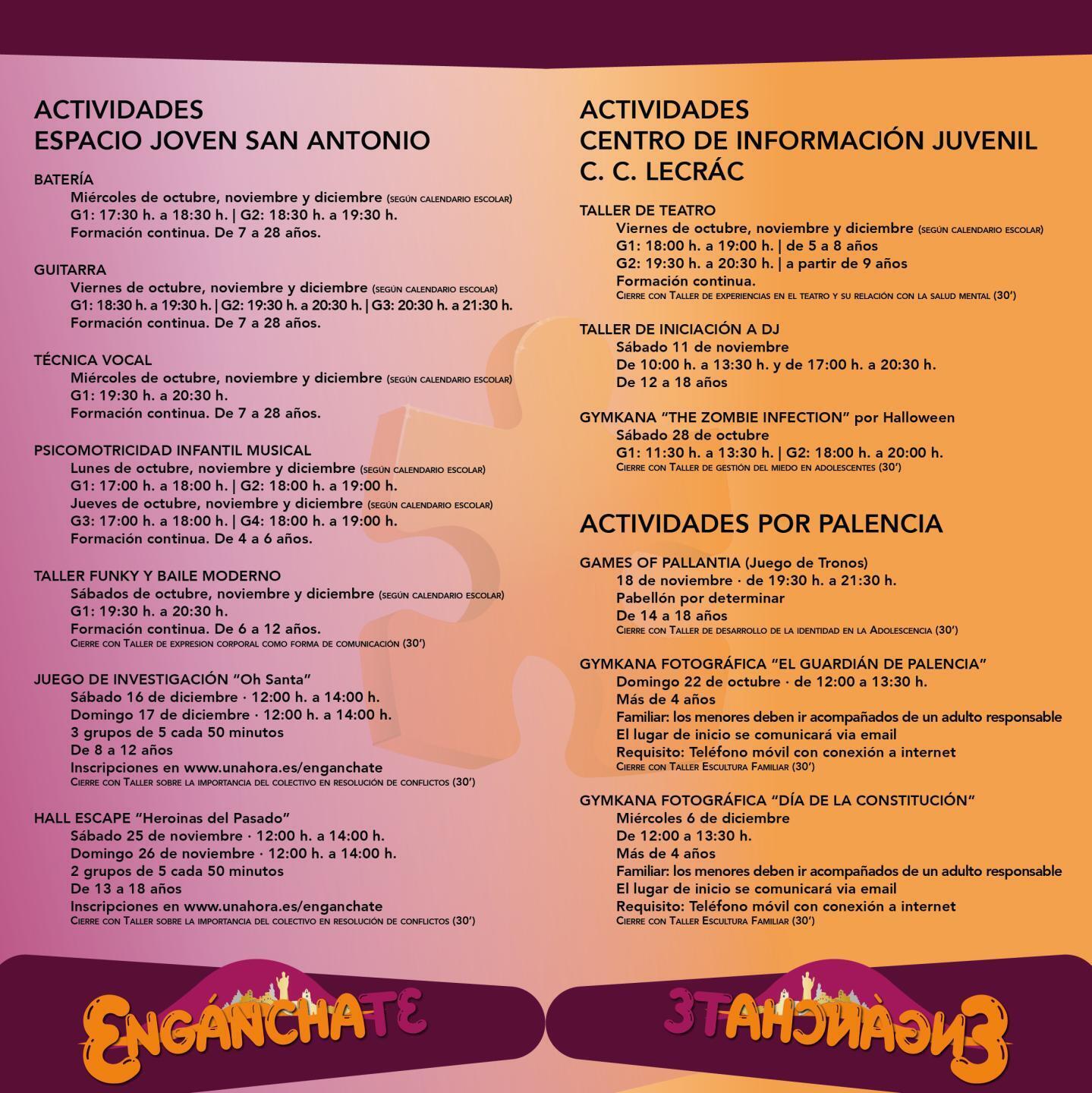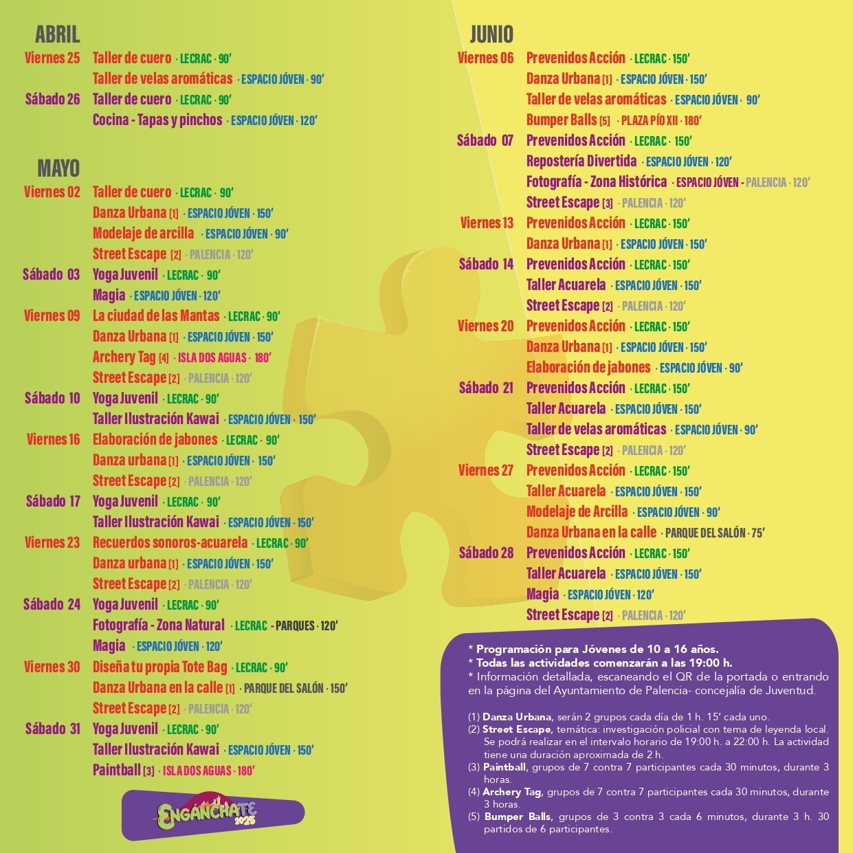 Se abre el plazo para la inscripción en las actividades del programa “Engánchate” del Ayuntamiento de Palencia, del 20 de septiembre a las 09:00 h. al 28 de septiembre a las 14:00 h.