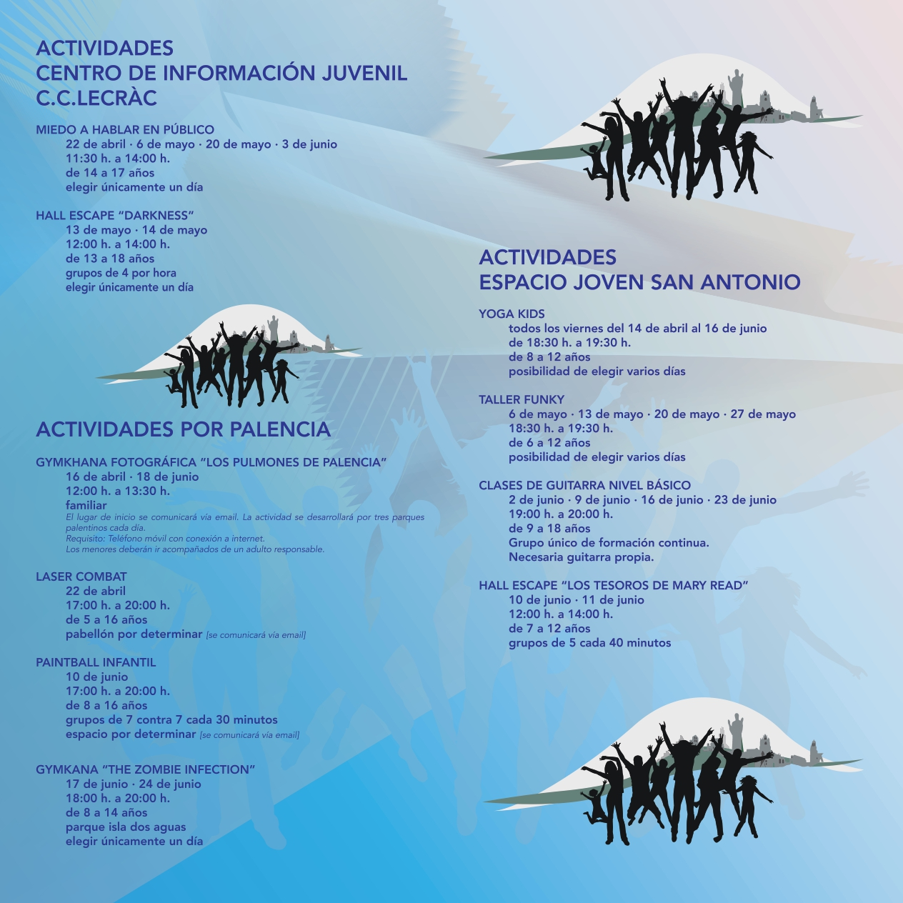El plazo de inscripción comenzará el 3 de abril a las 08:00 h., y finalizará el lunes anterior a cada actividad a las 14:00 h. Se realizará a través del correo electrónico juventud [at] aytopalencia.es, aportando: