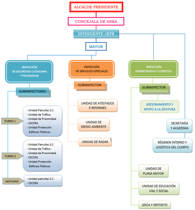 - Secretaría: Asistencia al Jefe del Cuerpo, Organización de Agendas, protocolo, transmisión de las órdenes de Servicio de Jefatura a los mandos.