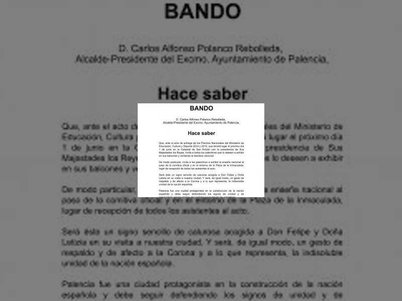 Que, ante el acto de entrega de los Premios Nacionales del Ministerio deEducación, Cultura y Deporte 201 4 y 201 5, que tendrá lugar el próximo día1 de junio en la Catedral de San Antolín con la presidencia de SusMajestades los Reyes, invita a todos los palentinos que lo deseen a exhibiren sus balcones y ventanas la bandera nacional.