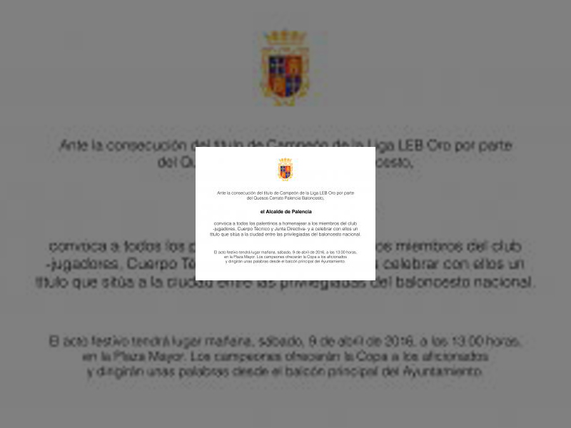 Ante la consecución del título de Campeón de Liga LEB Oro por parte del Quesos Cerrato Palencia Baloncesto, el Alcalde de Palencia convoca a todos los palentinos a homenajear a los miembros del club -jugadores, Cuerpo Técnico y Junta Directiva- y a celebrar con ellos un título que sitúa a la ciudad entre las privilegiadas del baloncesto nacional.