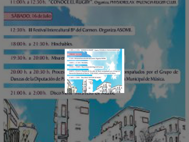 El programa de Fiestas del Barrio del Carmen cuenta con la participación de Concejalía de Barrios, Pirofiesta, Palencia Rugby Club, ASOMI y el Grupo de Danzas Zascandil.